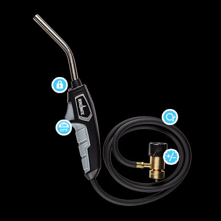 Biedt maximale toegankelijkheid voor kleine ruimtes met een 1,5 meter slang en handgreep. Direct aan/uit ontsteking biedt gemakkelijker verlichting en verhoogde brandstofbesparing. Geoptimaliseerd "Swirl" vlam brandt heter.