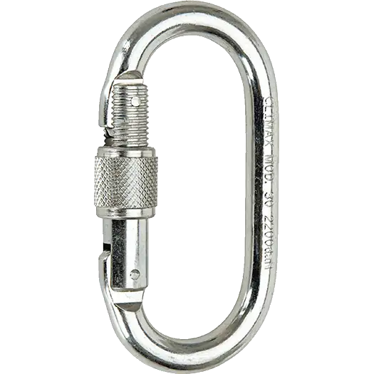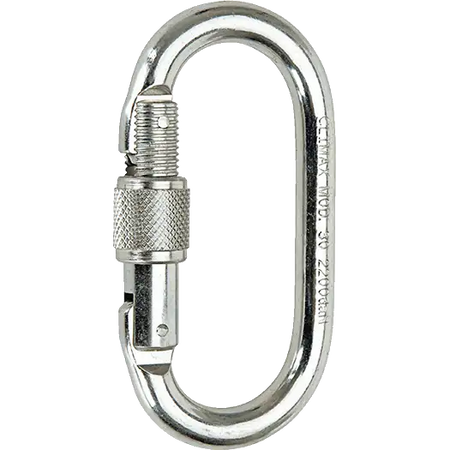 Symmetrische stalen karabijnhaak om de verschillende onderdelen van een valbeveiligings- of beveiligingssysteem met elkaar te verbinden en het hele systeem te verbinden met het verankeringspunt op de constructie waar de gebruiker werkt.