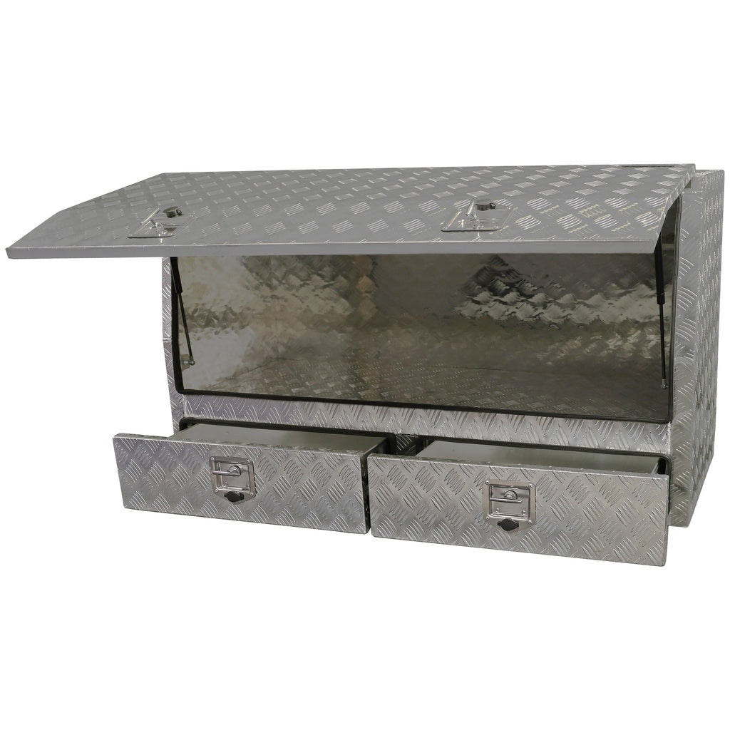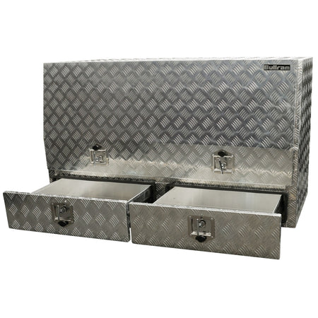 Deze Bullram opbergkist traanplaat met deur en 2 lades biedt veilige, overzichtelijke opbergruimte voor gereedschap, bevestigingsmateriaal en toebehoren op werkvoertuigen of in werkplaatsen. Deze aluminium opbergkist is opgebouwd uit 1,8 mm traanplaat en geschikt voor gebruik tijdens transport of opslag buiten.