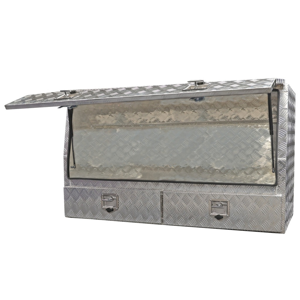 Het bovenvak opent soepel met gasveren en blijft openstaan tijdens gebruik. Binnenin bevindt zich een vast schap over de volledige breedte, ideaal voor het scheiden van kleinere materialen. Onderin zorgen twee volledig uittrekbare lades voor snelle toegang tot handgereedschap of verbruiksmateriaal. Deze opbergkist met lades voor voertuigen combineert toegankelijkheid met stevige opbouw.