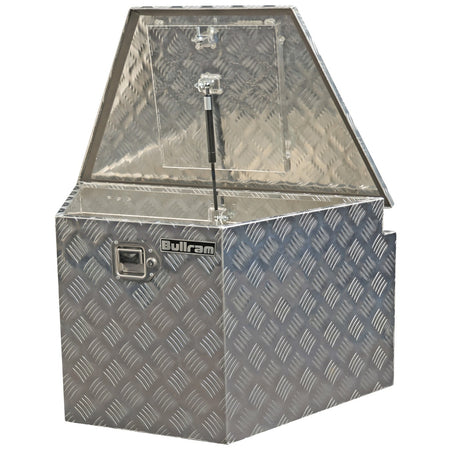 De Bullram disselkist is geschikt voor aanhangers, voertuigen en werkplekken waar weersbestendige opbergruimte nodig is. In deze aluminium disselbak blijven gereedschap, spanbanden en andere materialen beschermd tegen vocht en vuil, zowel tijdens transport als bij opslag buiten.